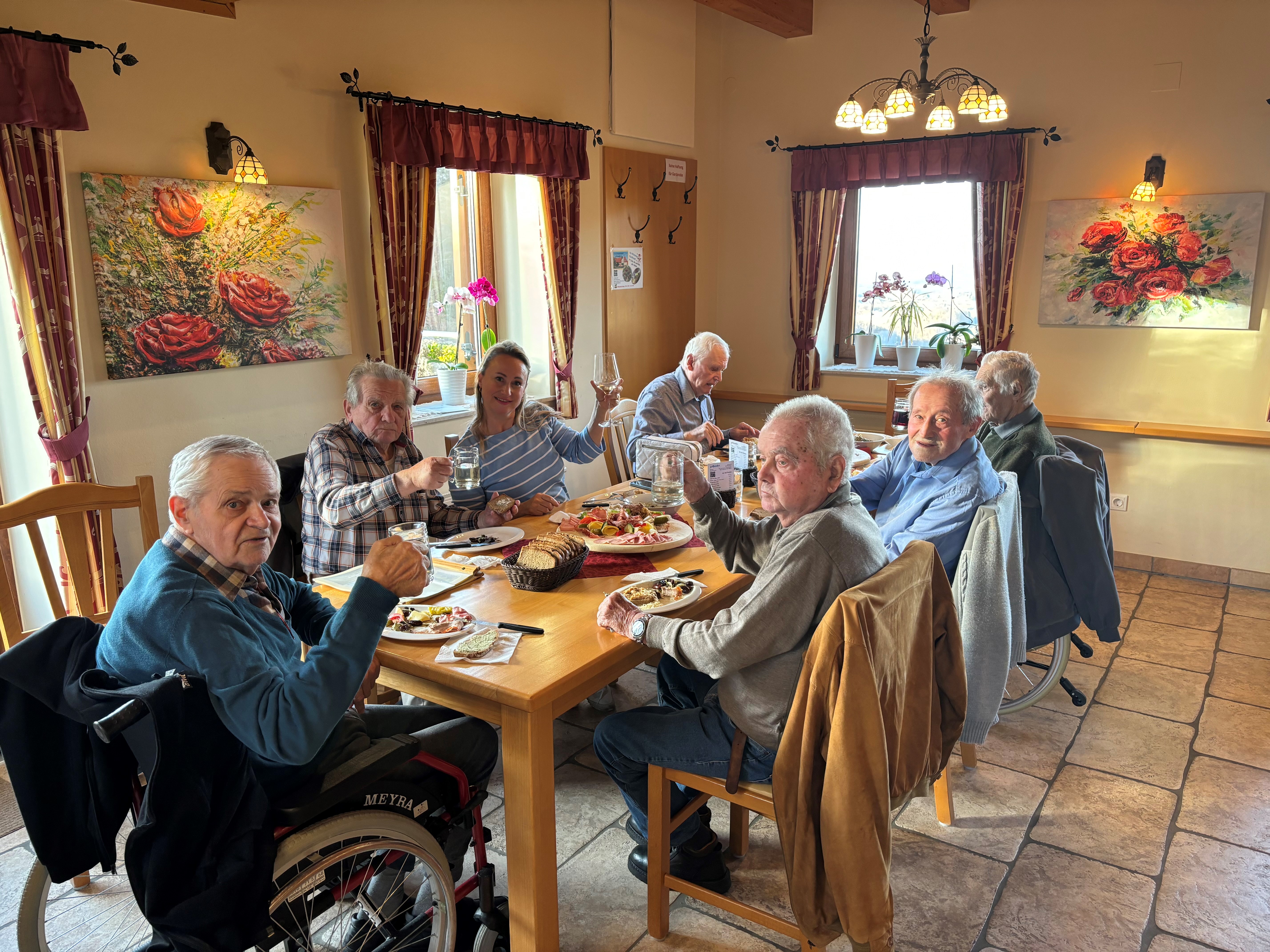 Im SeneCura Sozialzentrum St.Veit i.d. Südsteiermark wurde vor Kurzem ein toller Ausflug zum Buschenschank unternommen. Begleitet von einer Mitarbeiterin des Hauses wagte sich eine Runde voller Männer auf das Abenteuer und verbrachte eine schöne Auszeit in geselliger Runde. Angekommen beim Buschenschank begrüßte die Bewohner ein verlockendes Angebot an Speisen und Getränken. Mit leckeren Platten an unterschiedlicher Leckereien und köstlichem Brot ließen es sich die Bewohner und die Mitarbeiterin so richtig gut gehen. Es war ein sehr genussvoller und geselliger Tag, von dem die Männerrunde noch lange mit einem Schmunzeln im Gesicht erzählen wird.