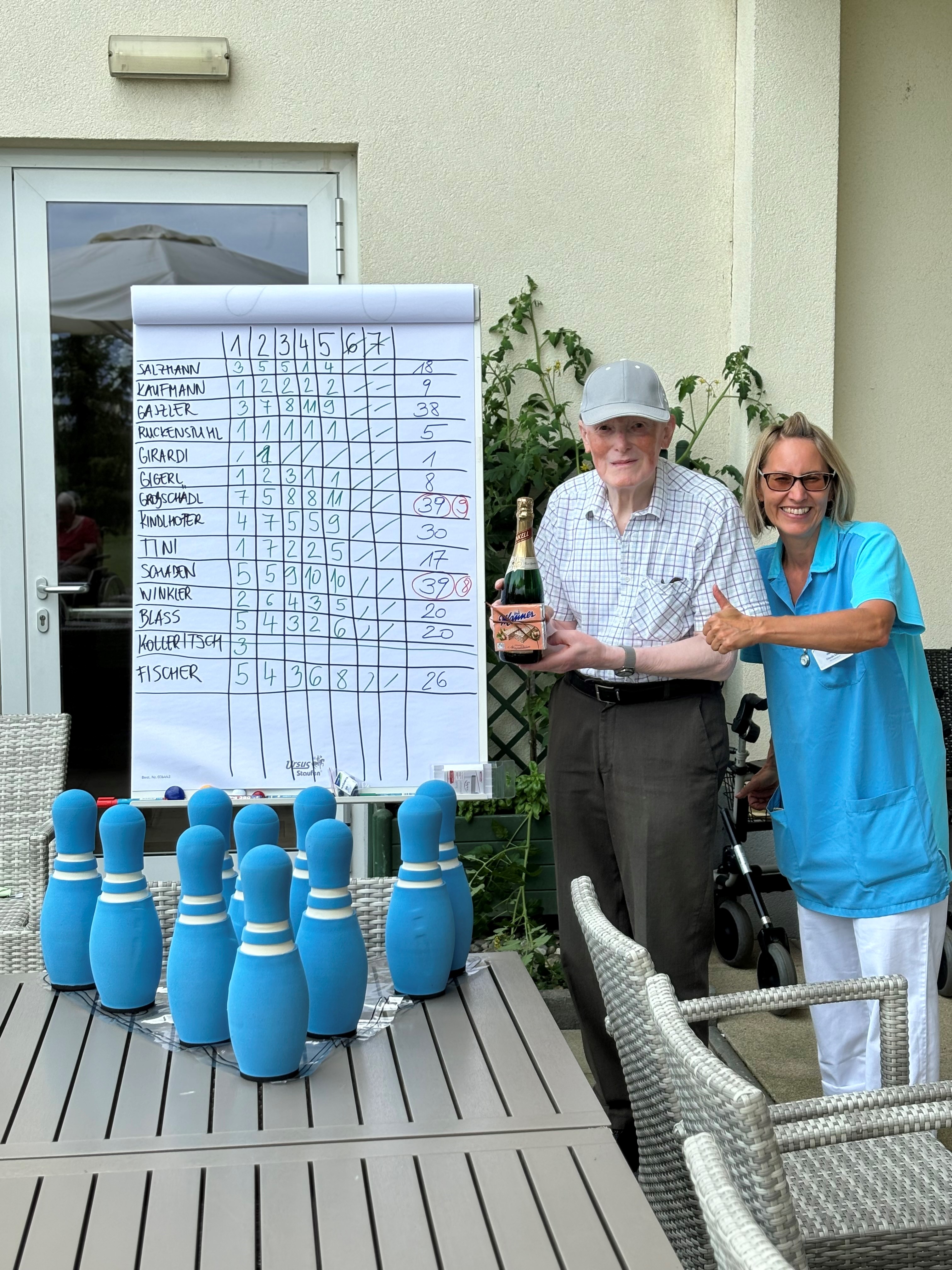 Im SeneCura Sozialzentrum St. Veit in der Südsteiermark wurde kürzlich ein spannendes Kegel-Turnier veranstaltet. Mit viel Begeisterung traten die Bewohner:innen gegeneinander an und zeigten ihr Können. Selbstverständlich stand nicht nur das Turnier, sondern auch der Spaßfaktor im Vordergrund. Dem Kegel-Turnier-Gewinner wurde eine Flasche Sekt mit einer Süßigkeit für die hervorragende Leistung überreicht.