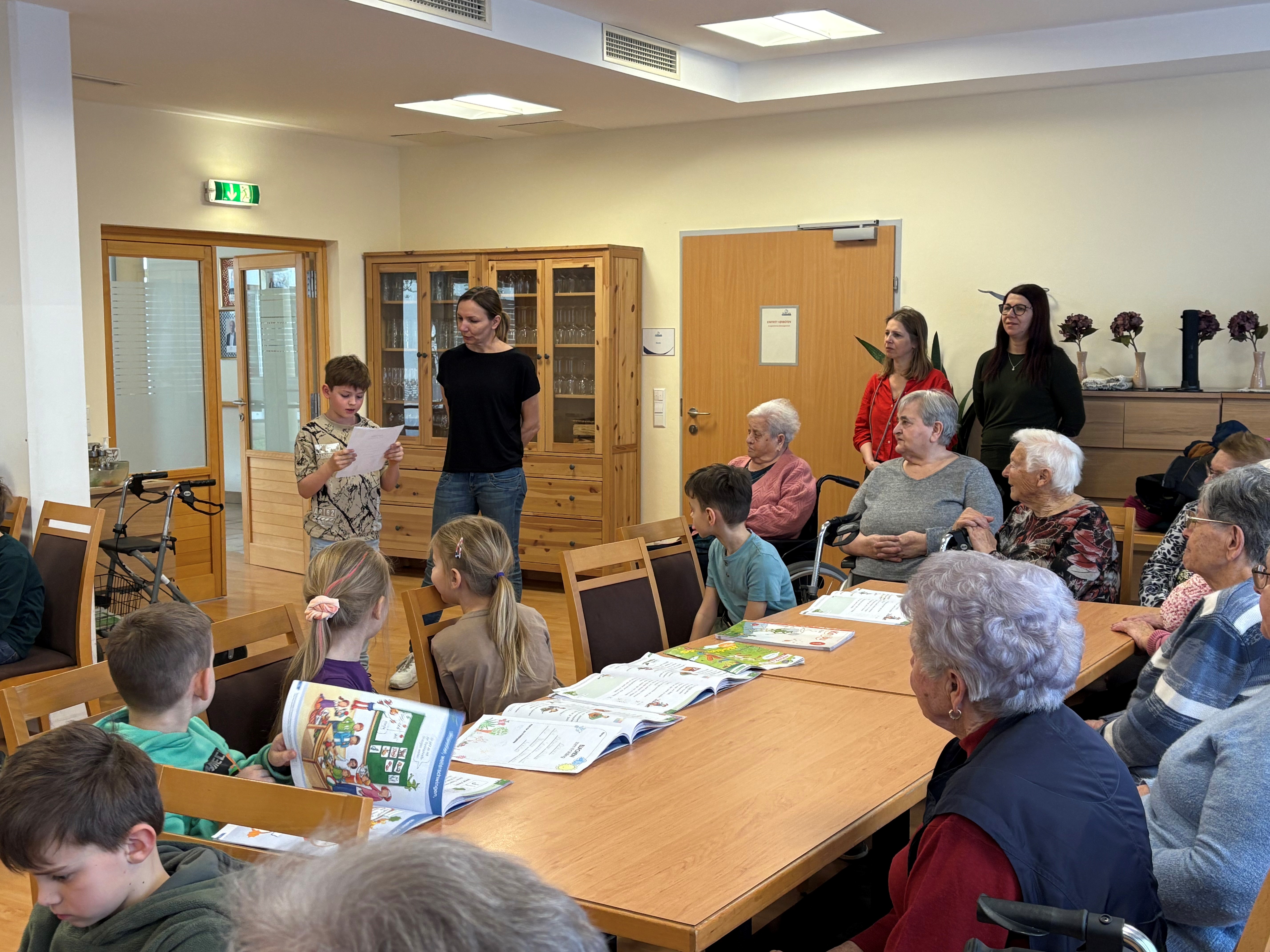 Kürzlich besuchten die Volksschüler:innen der 1. Klasse in Vogau, die Senior:innen des SeneCura Sozialzentrums St. Veit. Das lieb gewonnene Leseprojekt findet einmal pro Monat statt und neue Buchstaben bzw. kurze Textteile können bereits zur großen Freude aller vorgetragen werden. Zudem wird meistens auch ein Lied oder ein kurzes Gedicht zum Besten gegeben. Die Senior:innen und Kinder freuen sich über die gemeinsamen Stunden.