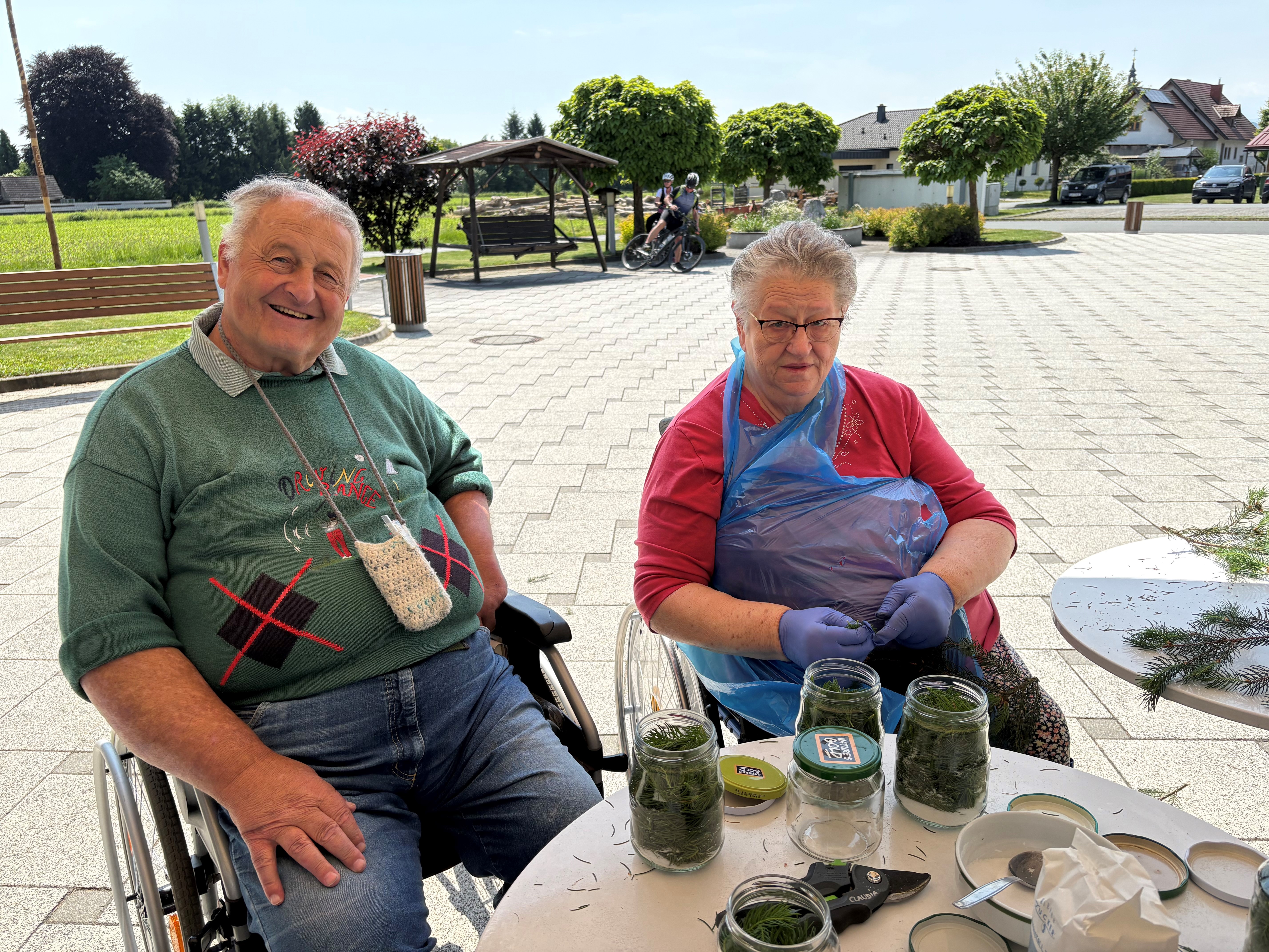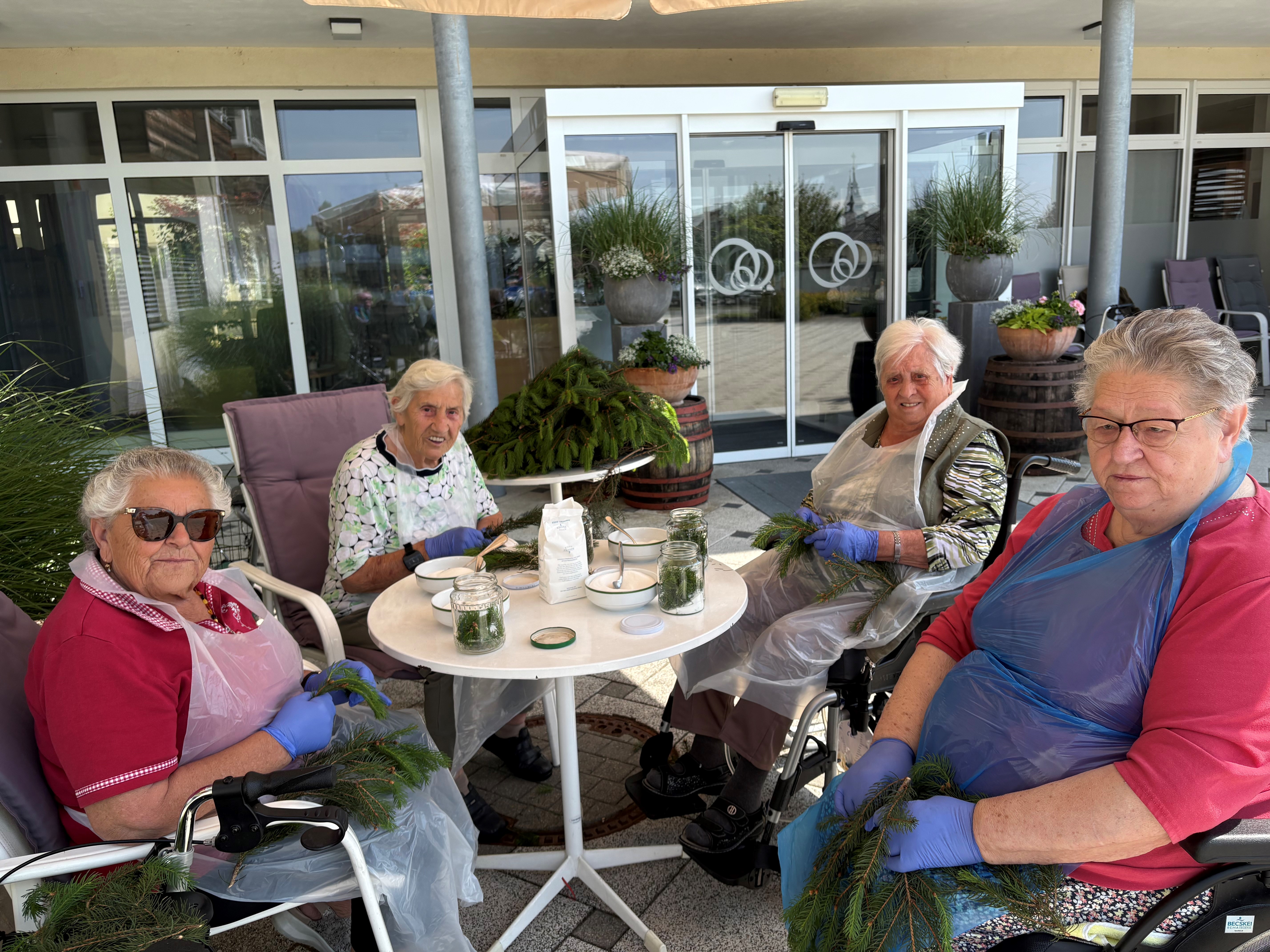 Kürzlich wurde im SeneCura Sozialzentrum St. Veit in der Südsteiermark Maiwipferlsaft hergestellt. Die kleinen, hellgrünen Triebe der Fichtenbäume werden hierzu Mai geerntet, denn zu diesem Zeitpunkt sind sie noch ganz weich und frisch. Die jungen Triebspitzen enthalten vor allem ätherische Öle, Harze und reichlich Vitamin C. Dieser Mix an Inhaltsstoffen hat eine antiseptische Wirkung, Maiwipferl in Form eines Sirups oder Tees sind ein altbekanntes Hausmittel, welches bei Erkältung und Husten sehr gut wirkt. Die Bewohner:innen des Hauses waren begeistert, als sie mit den frischen Wipferln überrascht wurden. Gemeinsam wurden die frischen Fichtenwipferl schichtweise mit Zucker in Gläser gefüllt. Ein herrlicher Nachmittag, den alle sehr genossen und wo man sich untereinander austauschen konnte.
