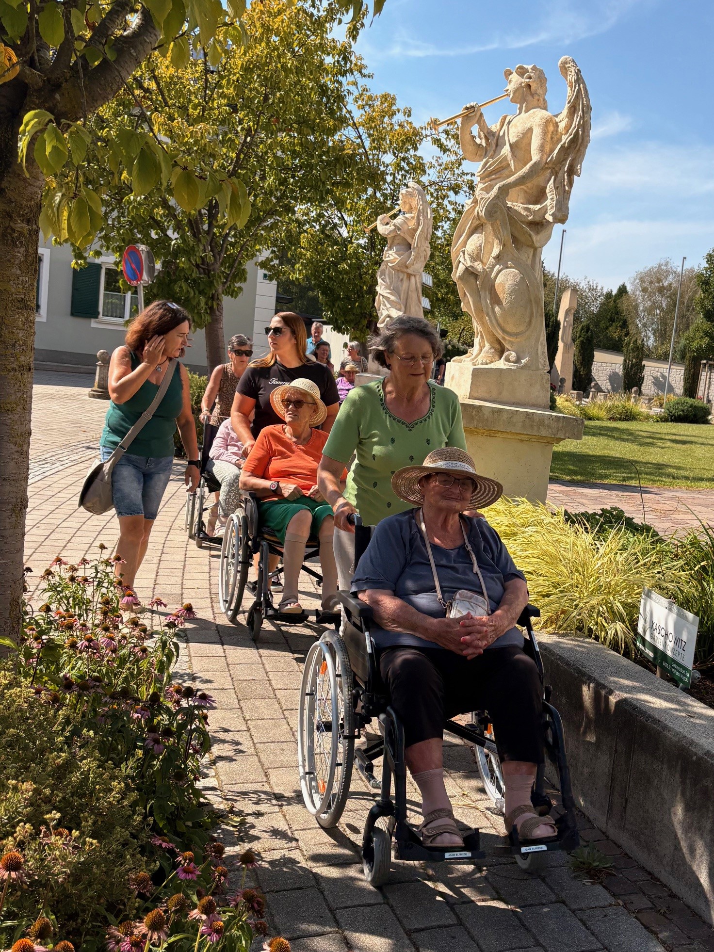 Kürzlich fand im SeneCura Sozialzentrum St. Veit in der Südsteiermark eine Rollstuhlausfahrt für zahlreiche Bewohner:innen statt, die von den ehrenamtlichen Mitarbeiterinnen begleitet wurde. Ziel war die Konditorei Kaiser, bei der die Ausflügler:innen mit köstlichen Spezialitäten und Getränken verwöhnt wurden. Das Wetter spielte hervorragend mit, weshalb alle den Besuch in der Konditorei auf der Terrasse in vollen Zügen genossen. Der Ausflug sorgte für viel Spaß, tolle Erinnerungen und dankbare Gesichter.